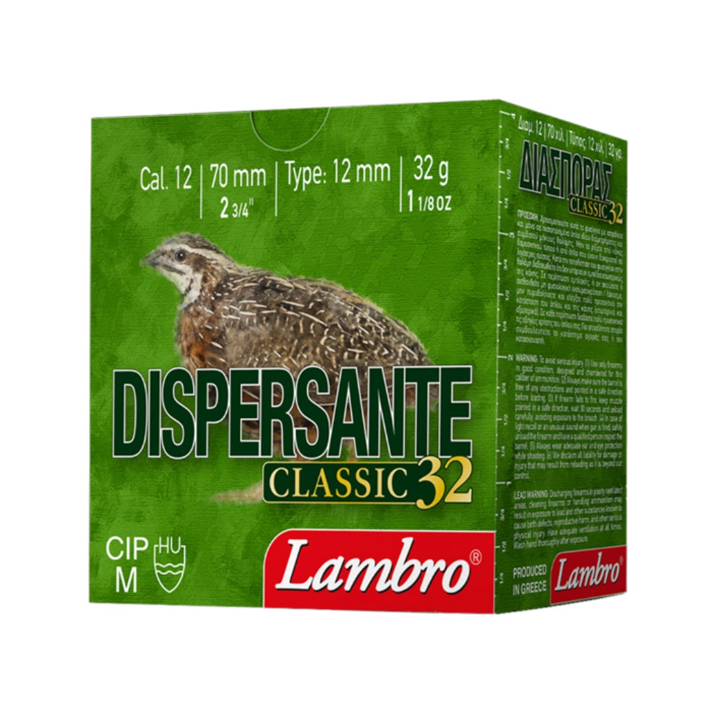Φυσίγγι Κυνηγίου Lambro DISPERSANTE CLASSIC 32. Ενδεδειγμένο φυσίγγι διασποράς για το κυνήγι μικρών θηραμάτων. Ιδανικό για κυνήγι ορτυκιού, κυνήγι τσίχλας, κυνήγι κοτσυφιού και περιπατητό κυνήγι. Λόγω του χαμηλού λακτίσματος είναι ιδιαίτερα βολικό για τους κατόχους παλαιών ή ελαφρών δικάννων. Για ακόμα μεγαλύτερη διασπορά συνιστούμε την χρήση ανοικτών τσοκ (CL-IC).